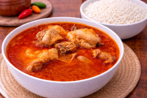 Rice with groundnut soup is a rich and comforting Ghanaian dish made with creamy peanut (groundnut) soup served alongside soft, fluffy rice. The soup is deeply flavorful, combining peanuts, tomatoes, spices, and protein such as chicken, beef, or fish. It is a popular dish across Ghana, known for its nutty taste, smooth texture, and satisfying warmth.