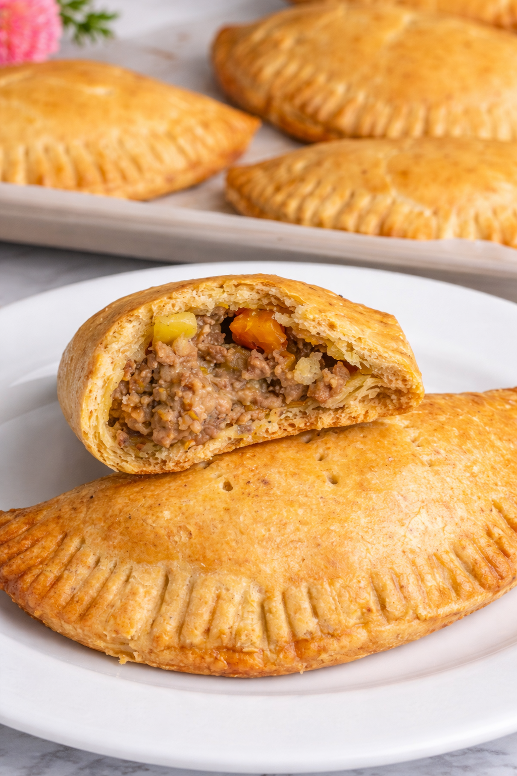 Place pies on a baking tray and bake in a preheated oven at 180°C (350°F) for 25–30 minutes or until golden brown.