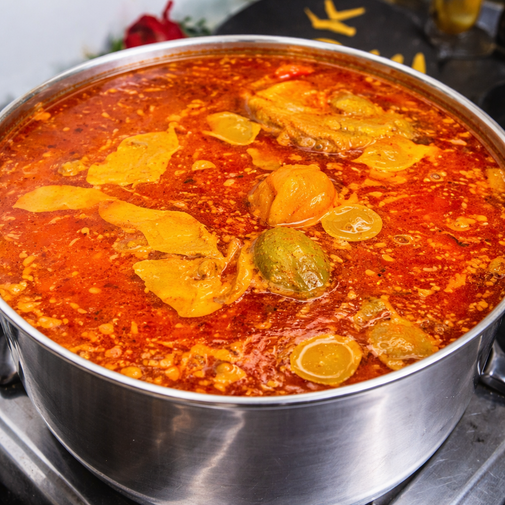 Increase the heat slightly and allow the soup to come to a gentle boil. Stir occasionally to prevent sticking at the bottom of the pot. As the soup cooks, the peanut oil will begin to rise to the surface, indicating proper cooking.